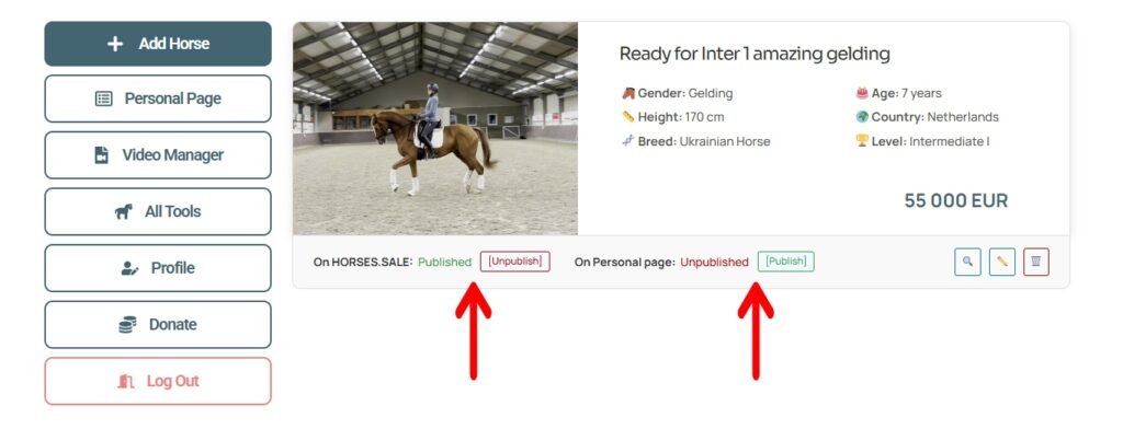 This option publishes the horse on the seller’s personal HORSES.SALE page, allowing the seller to easily share the listing link with potential clients or embed it on an external website.