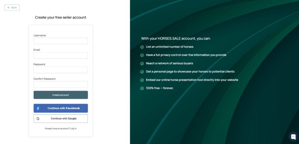 Step 1. Create a seller account. Register on HORSES.SALE using a custom username and password, or sign in quickly with Google or Facebook authorization.