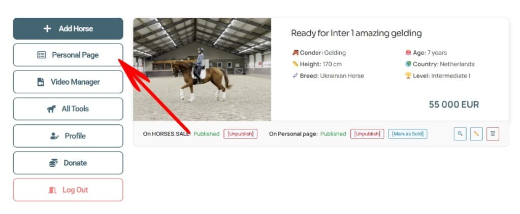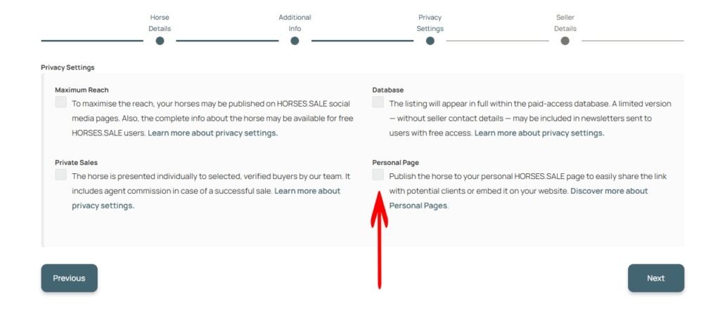Step 2. Add horses to your account. When submitting a horse, select the “Personal Page” option in the Privacy Settings section. Only listings with this option enabled will appear on your personal page. For detailed instructions, see [Submitting a Horse].