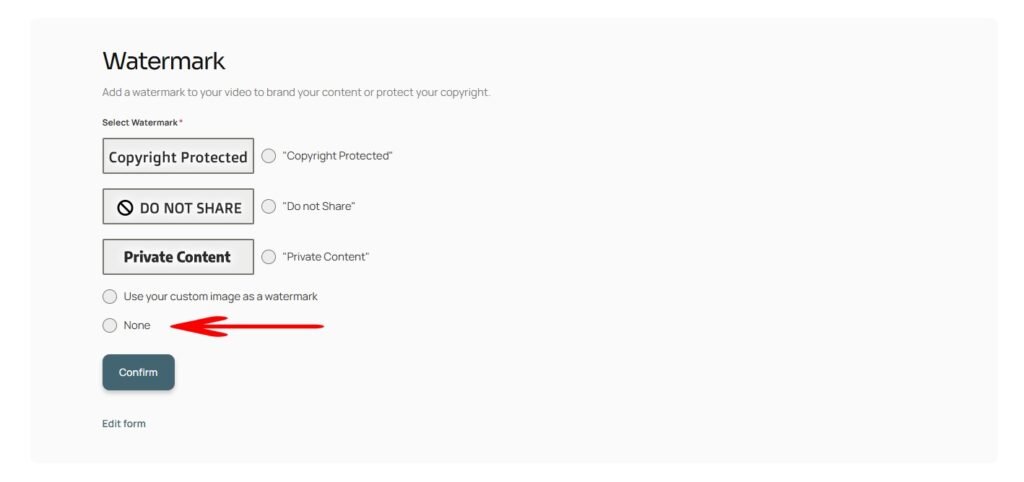 Step 7 (optional) . To remove the watermark, select the “None” option and click “Confirm”.