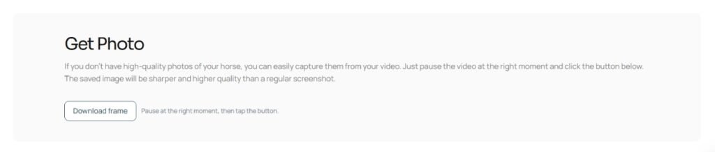If you have a horse sales video but no photos, you can use the Frame Extractor tool in the HORSES.SALE Video Manager to create photos directly from your video. This feature allows you to capture still frames of your horse at any moment in the video.