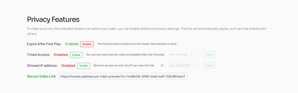 The HORSES.SALE Video Manager allows you to apply privacy settings to protect your videos from unauthorized viewing. These settings ensure that your sales content is shared securely and viewed only under the conditions you choose.