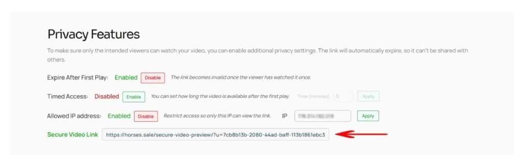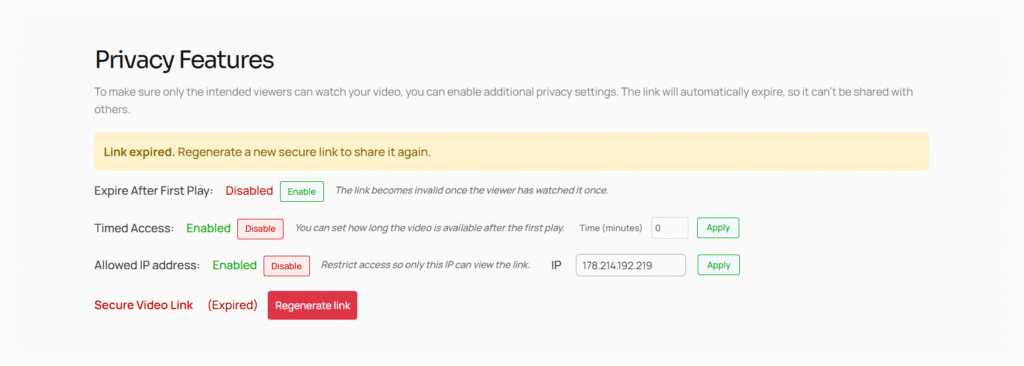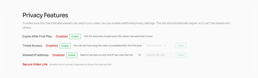 Step 5. Activate one or two privacy features by clicking the “Enable” buttons. For the “Timed Access” option, set the number of minutes the link is available after the first view and click the “Apply” button. For the “Allowed IP address” option, specify the allowed IP address and click the “Apply” button.