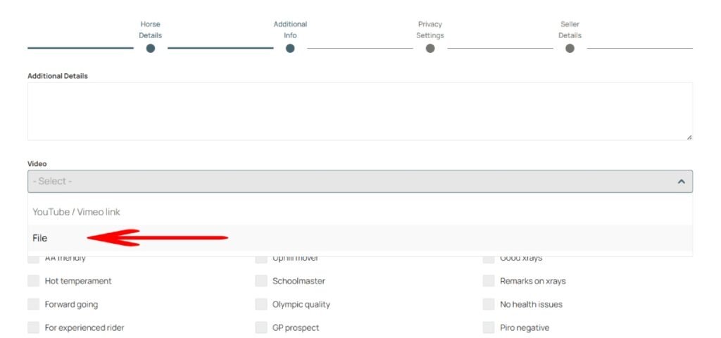 If you are submitting a horse to be published in the HORSES.SALE Closed Database or on your Personal Page, you can upload the video directly during the listing creation process.