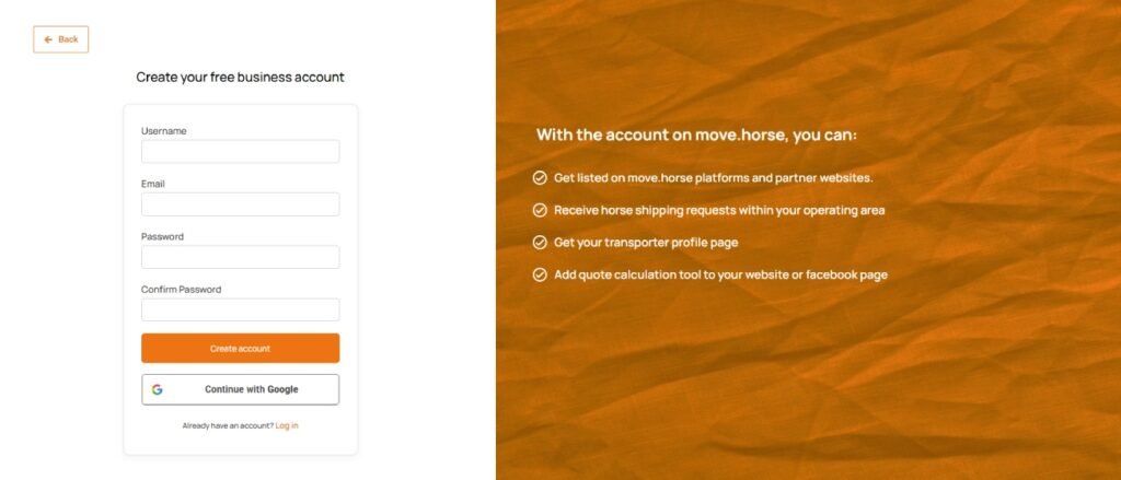 Step 1. Create a free transporter account. Register a transporter account on the Move Your Horse website. You can create a custom login or sign in quickly using supported authorization methods.