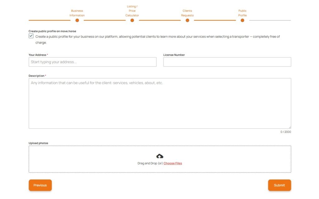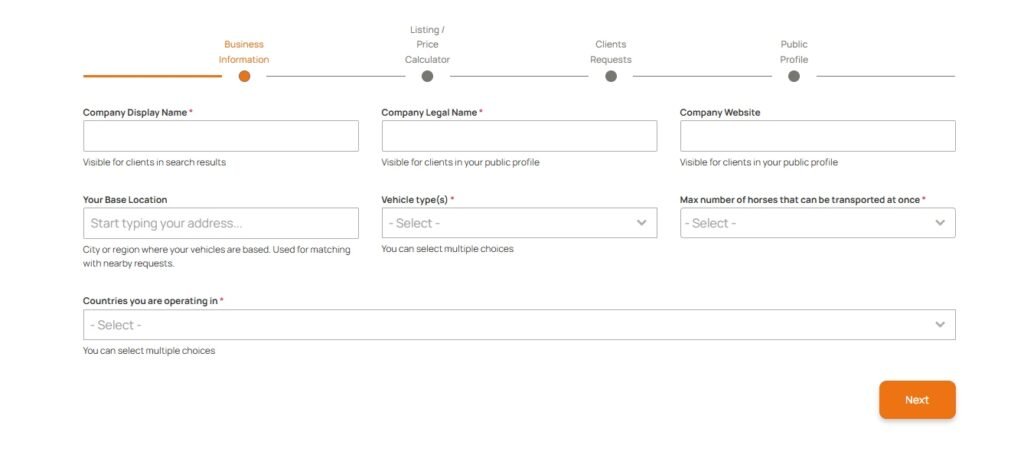Step 2. Add your business details. The registration form includes several steps. The more information you provide, the more Move Your Horse features will be available to you.
