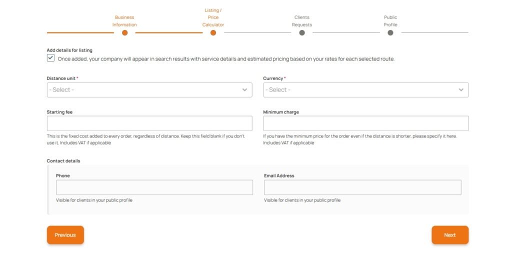 Step 2b. Add your pricing details to make your company appear in search results with estimated transport costs.