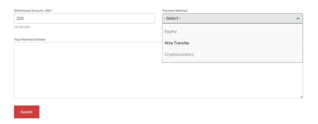 Once the total rewards balance on your affiliate account reaches 50 USD or more, you can withdraw your funds using one of the available payment methods: Wire Transfer, PayPal, or Cryptocurrency.